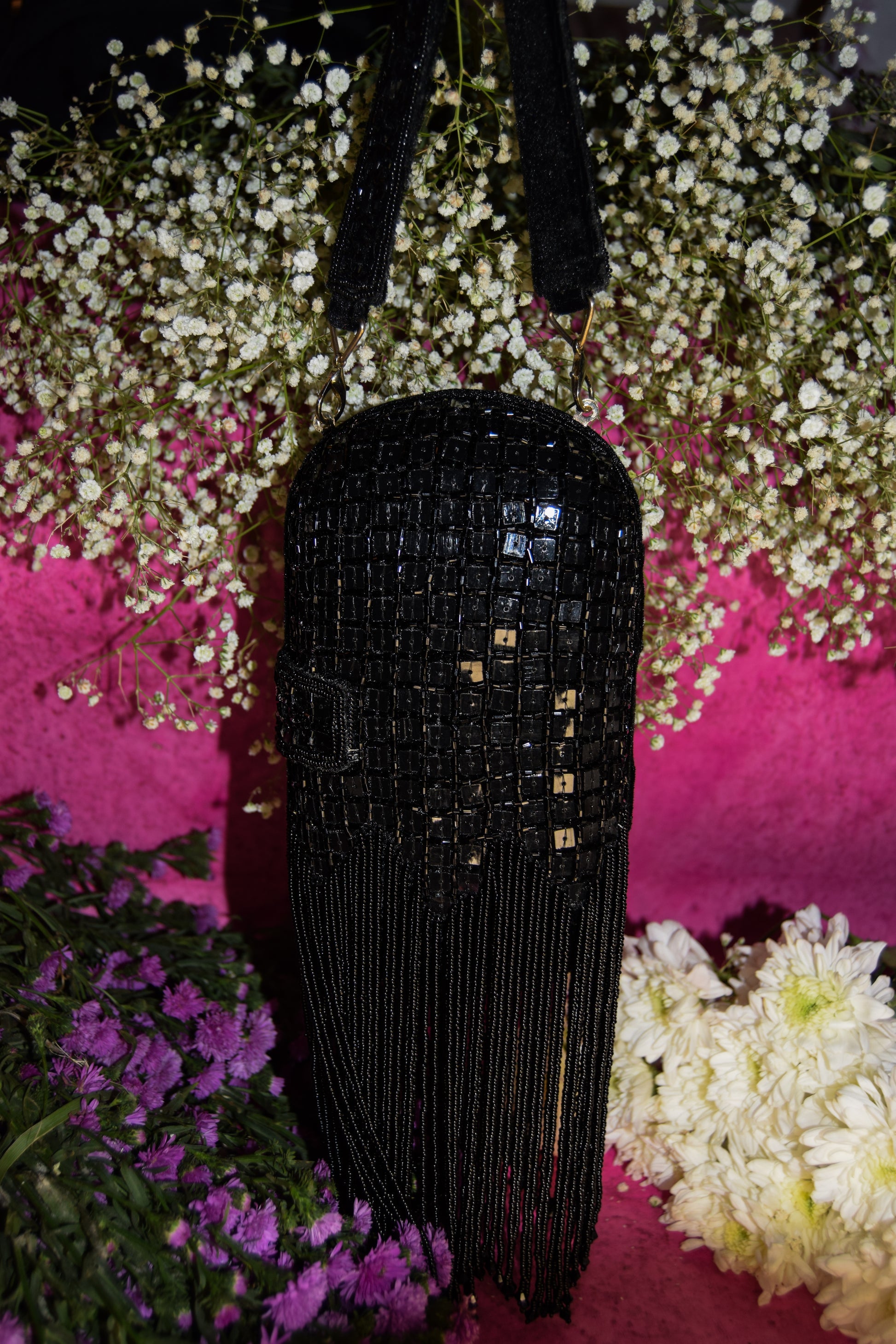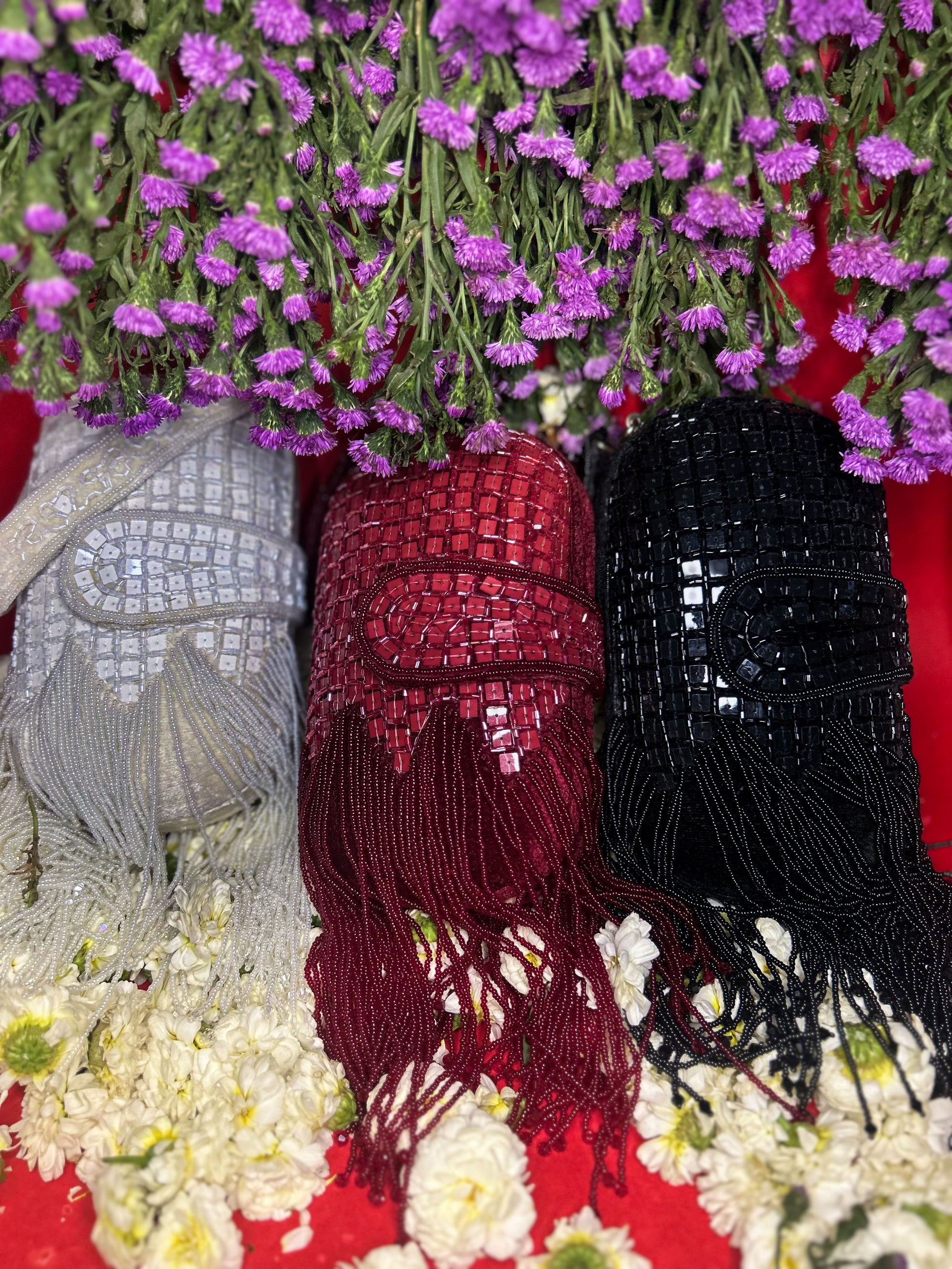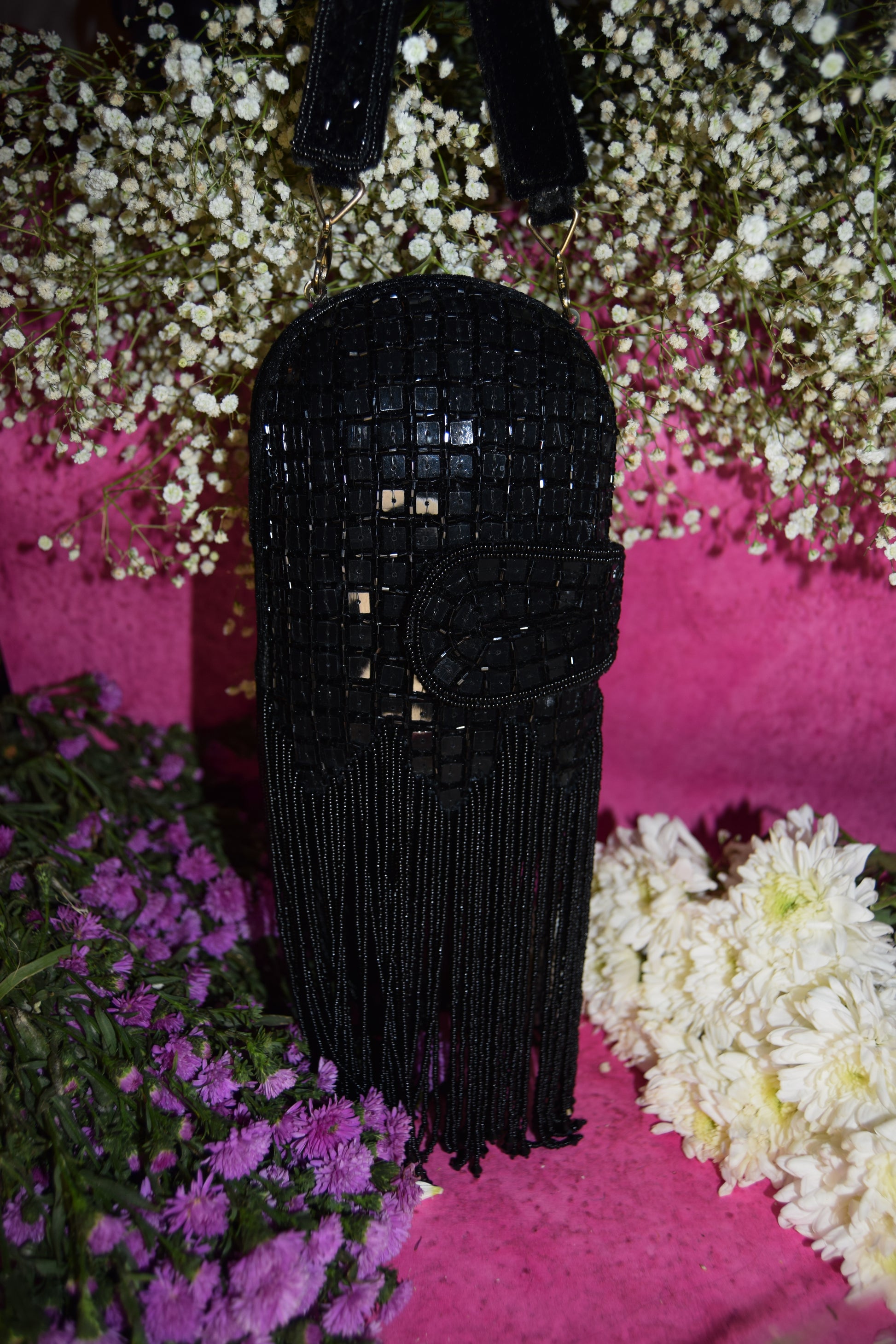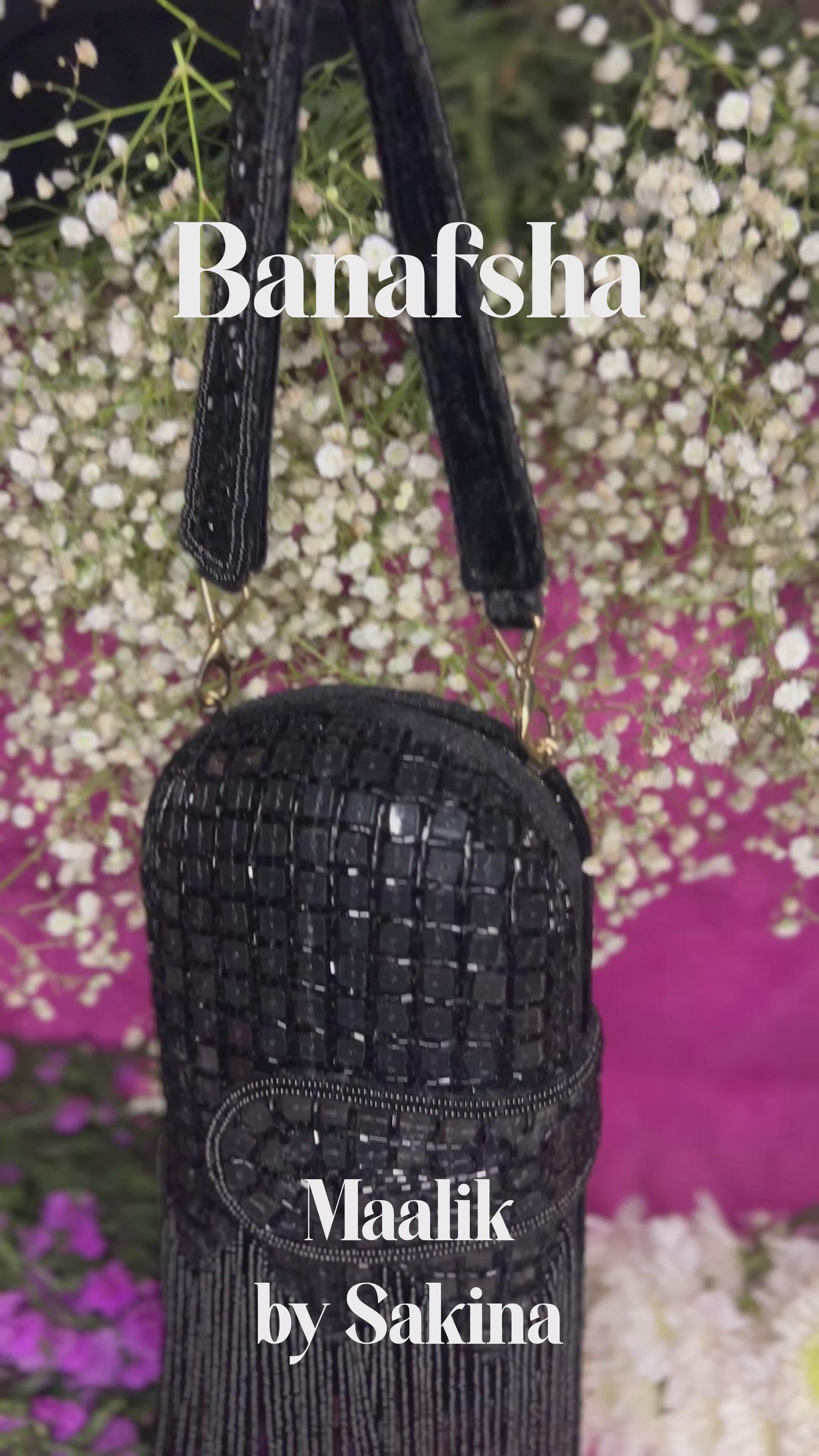 Banafsha is a striking capsule-shaped bag featuring intricate chip work all over, finished with cascading long tassels that add fluid motion and charm. Comes in Maroon, Black, and White, with two detachable straps — one embellished and one metal chain — for versatile styling. A perfect pick for evening glamour.