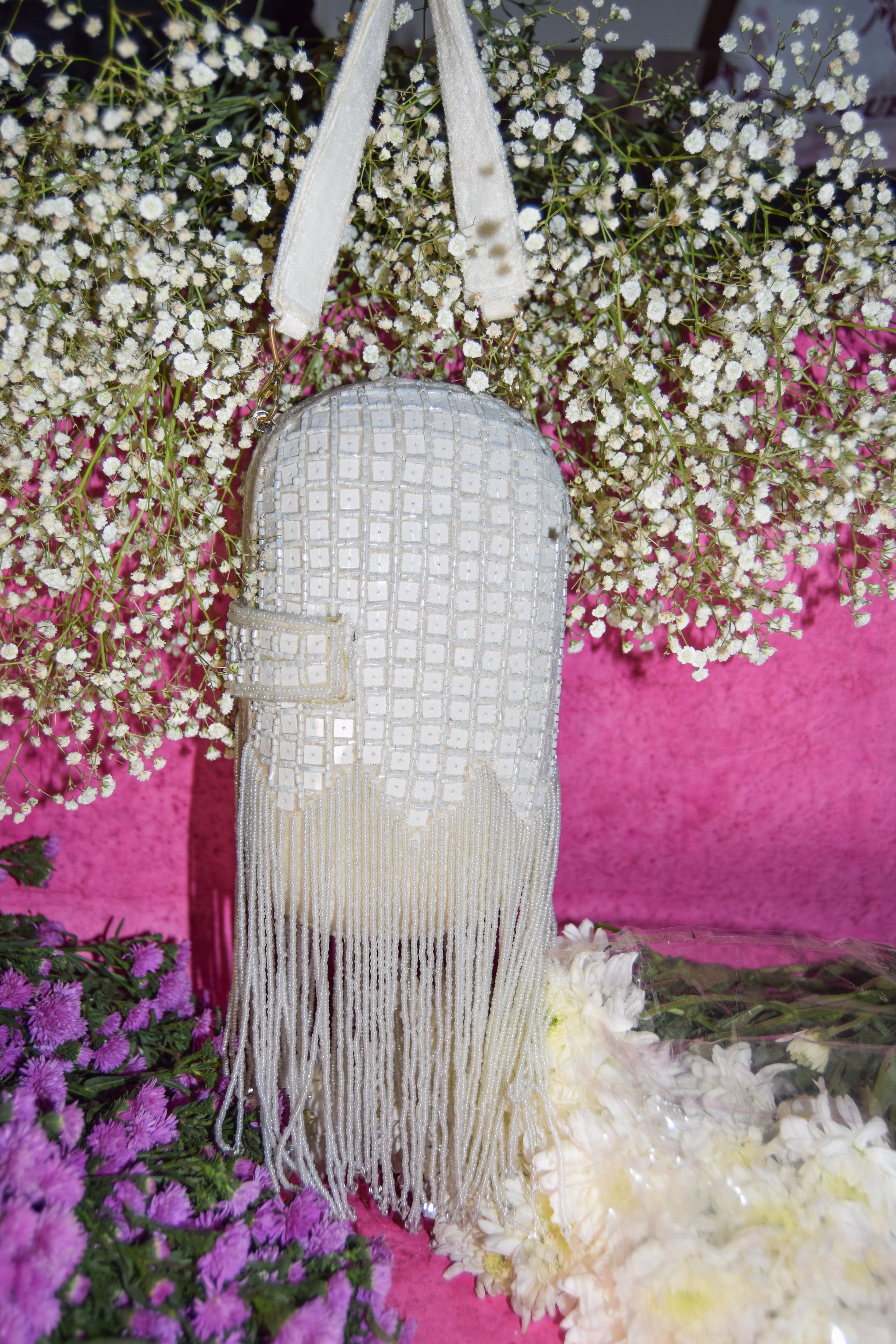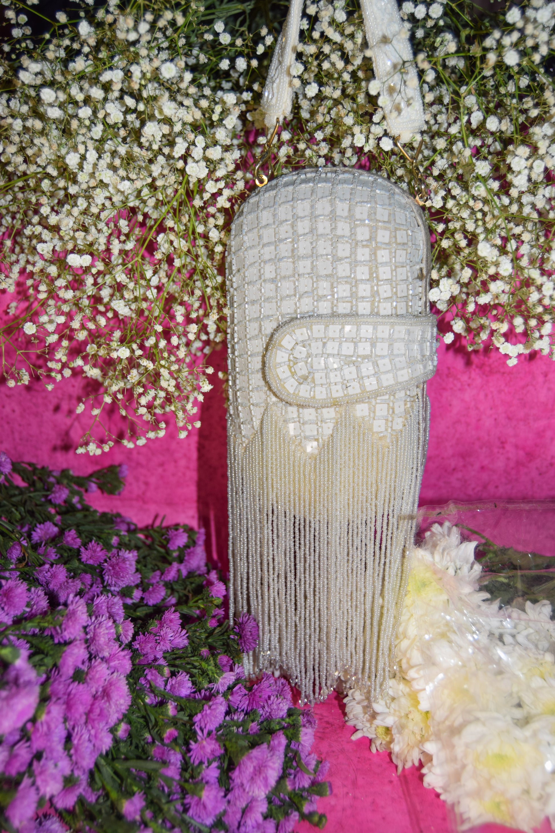 Banafsha is a striking capsule-shaped bag featuring intricate chip work all over, finished with cascading long tassels that add fluid motion and charm. Comes in Maroon, Black, and White, with two detachable straps — one embellished and one metal chain — for versatile styling. A perfect pick for evening glamour.
