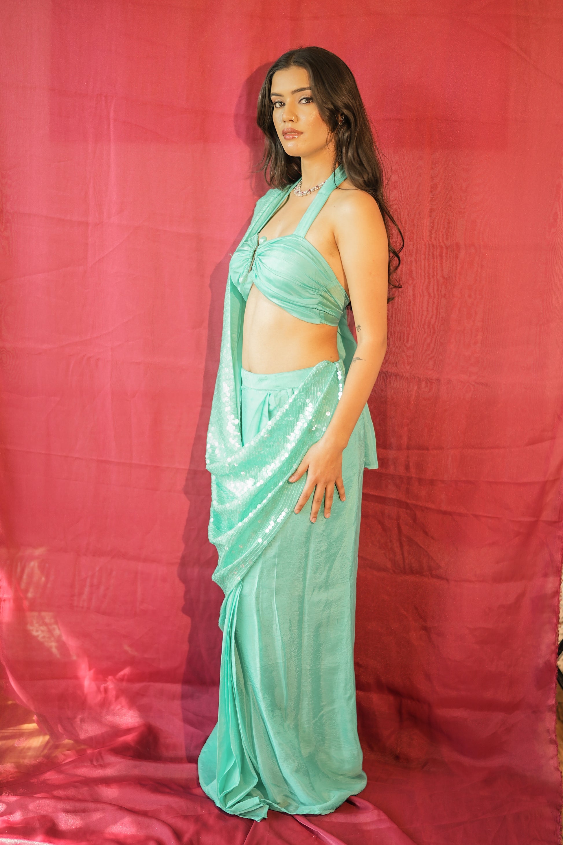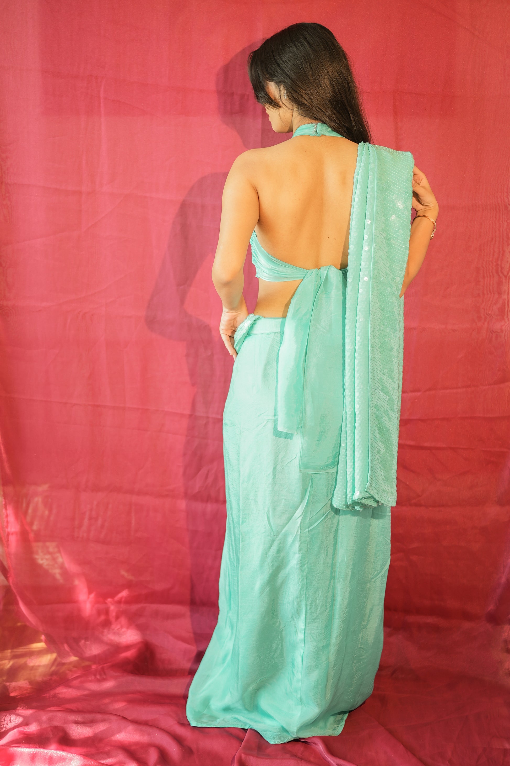 - pre draped saree in aqua -sequin pallu and blouse with stone brooch -the blouse has back tie for easy adjustments