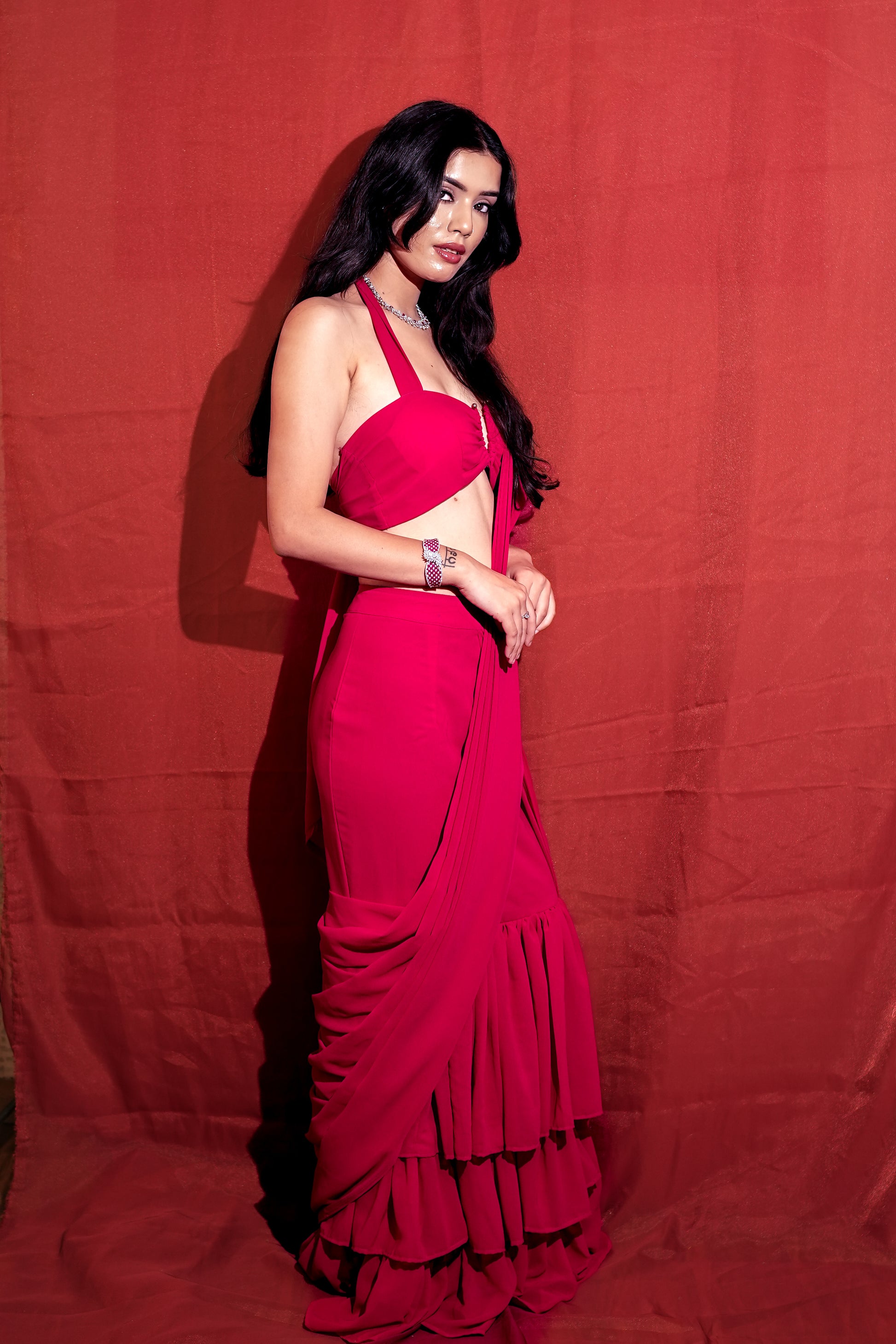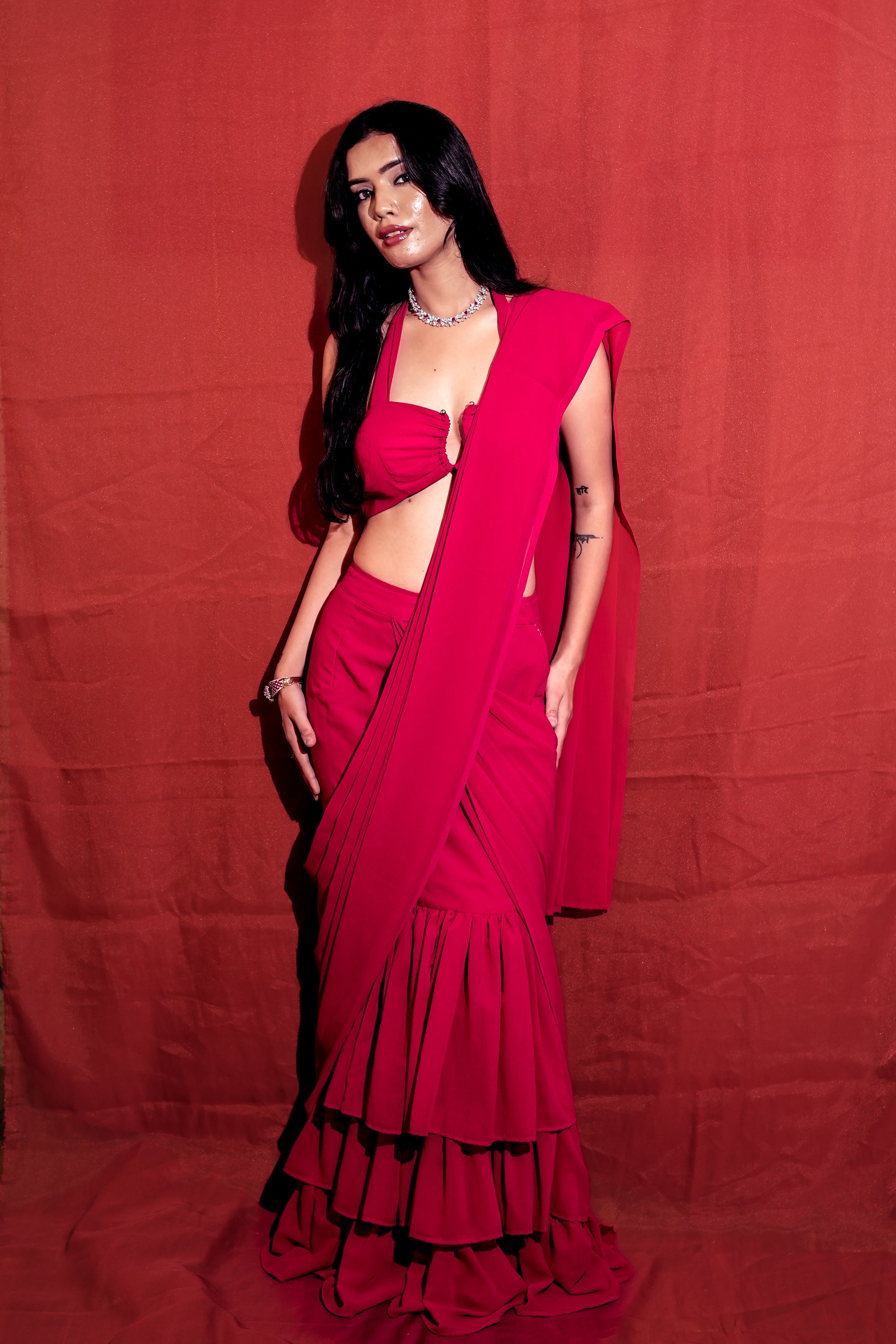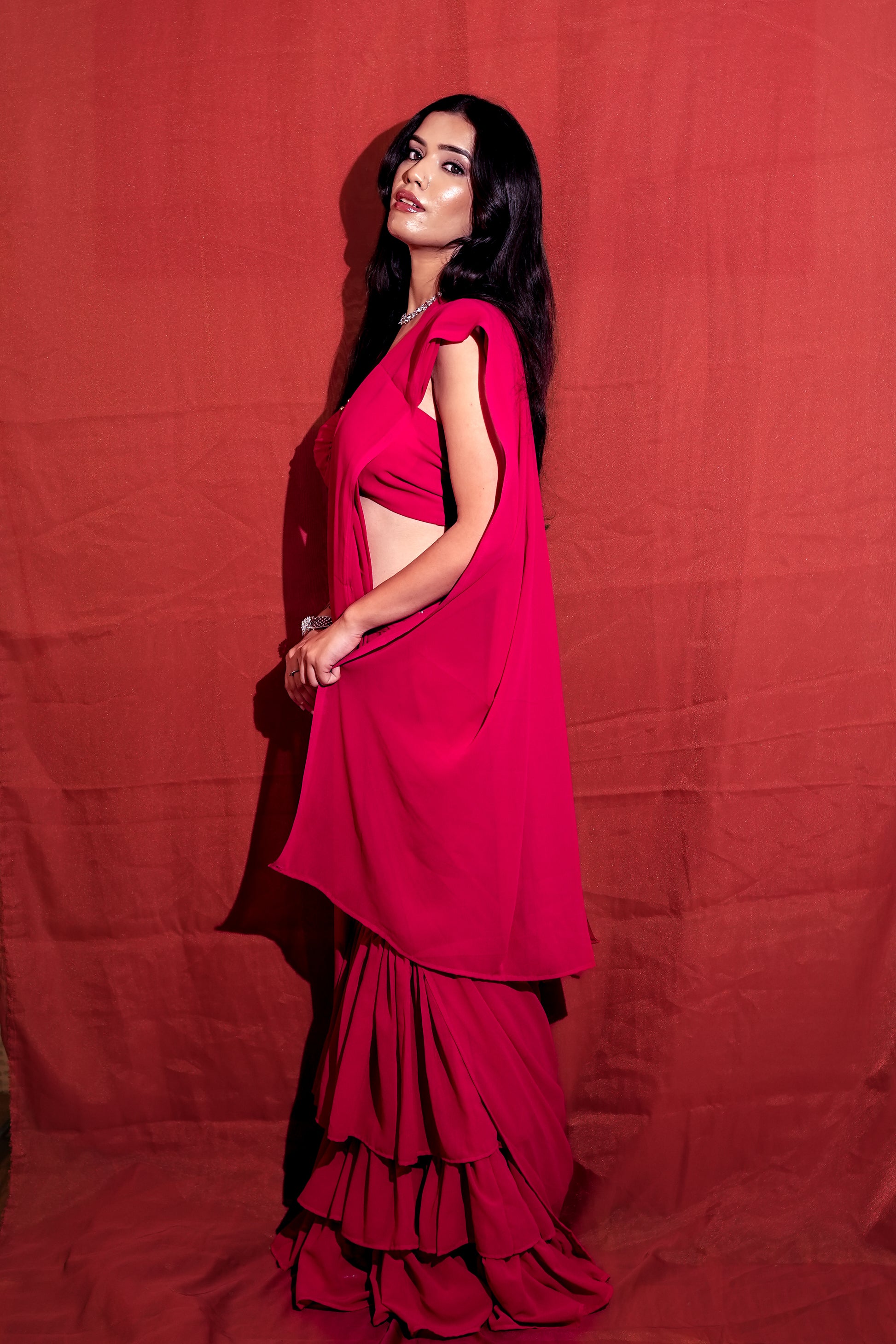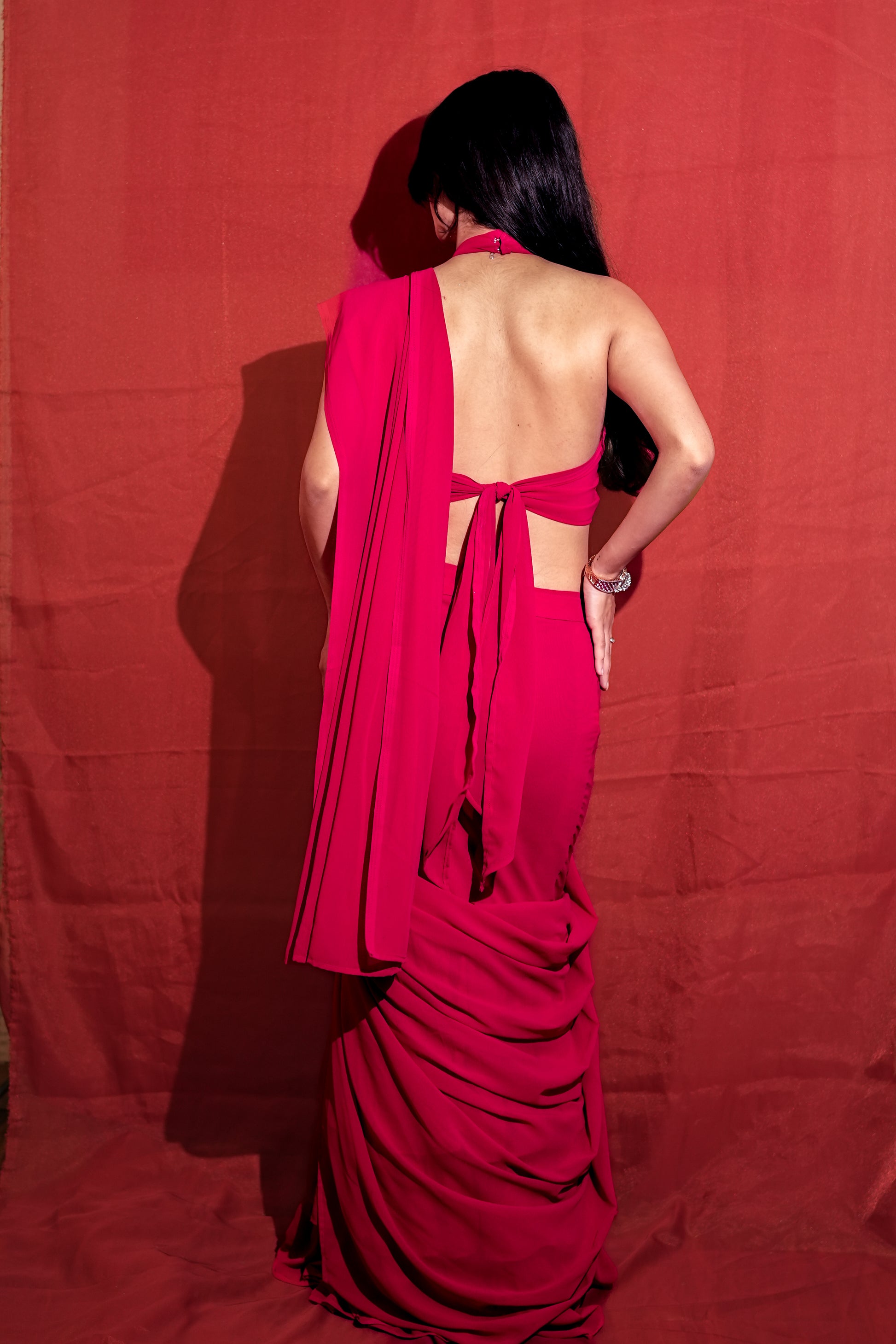 -georgette pre draped saree with backtie blouse -blouse has backties for easy adjustments