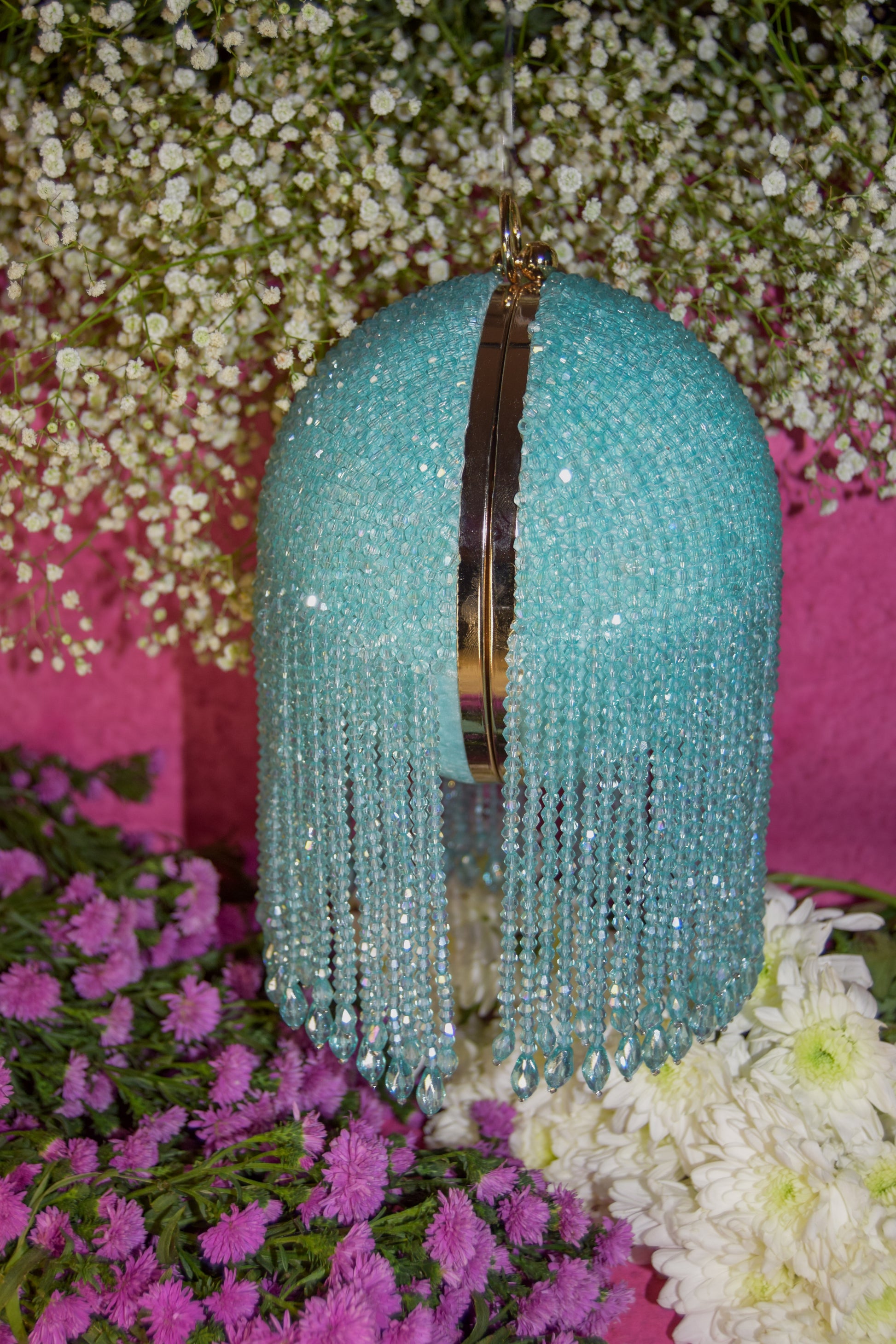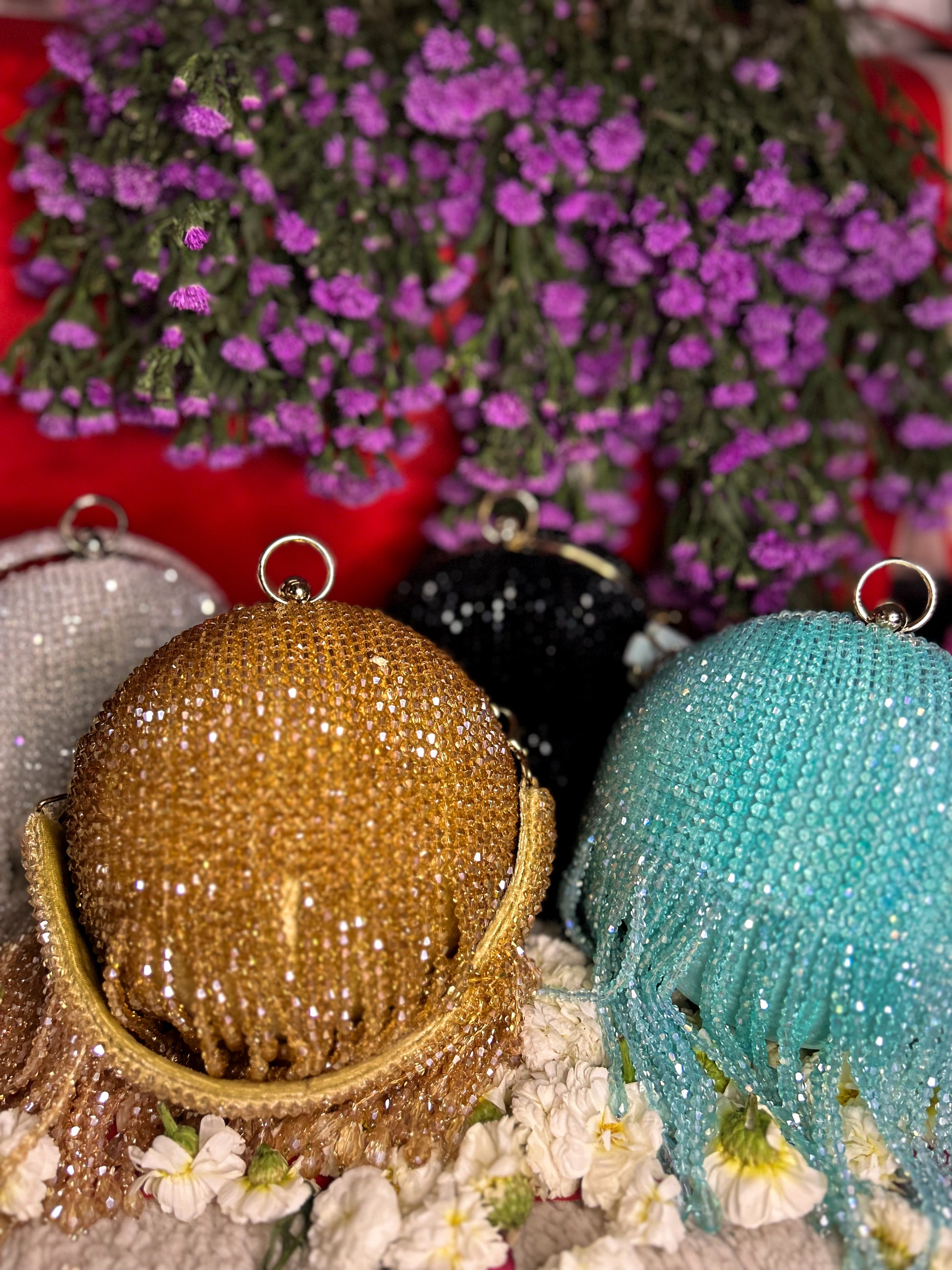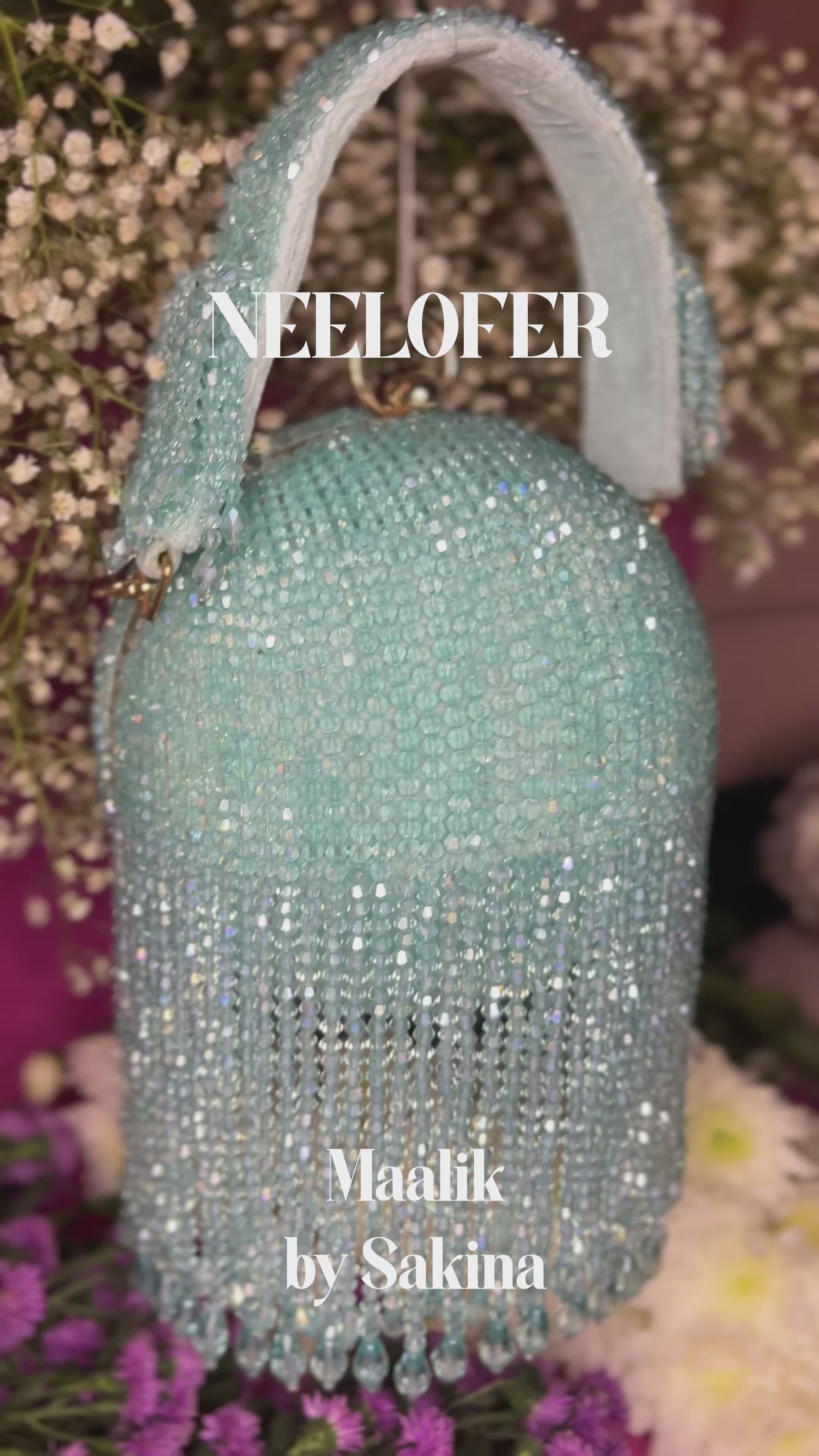 Neelofer is a ball bag adorned with heavy crystal work, available in four colours—turquoise, black, white, and yellow gold. It comes with two interchangeable straps: a sleek metal chain and a hand-embroidered belt.
