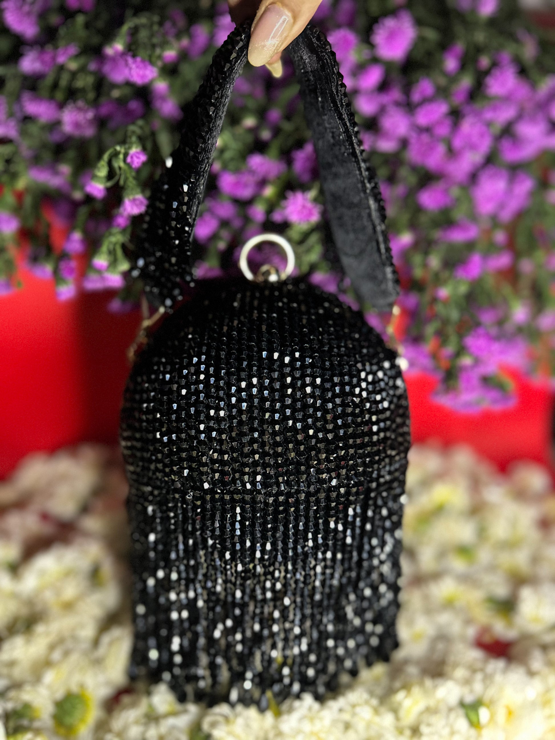Neelofer is a ball bag adorned with heavy crystal work, available in four colours—turquoise, black, white, and yellow gold. It comes with two interchangeable straps: a sleek metal chain and a hand-embroidered belt.
