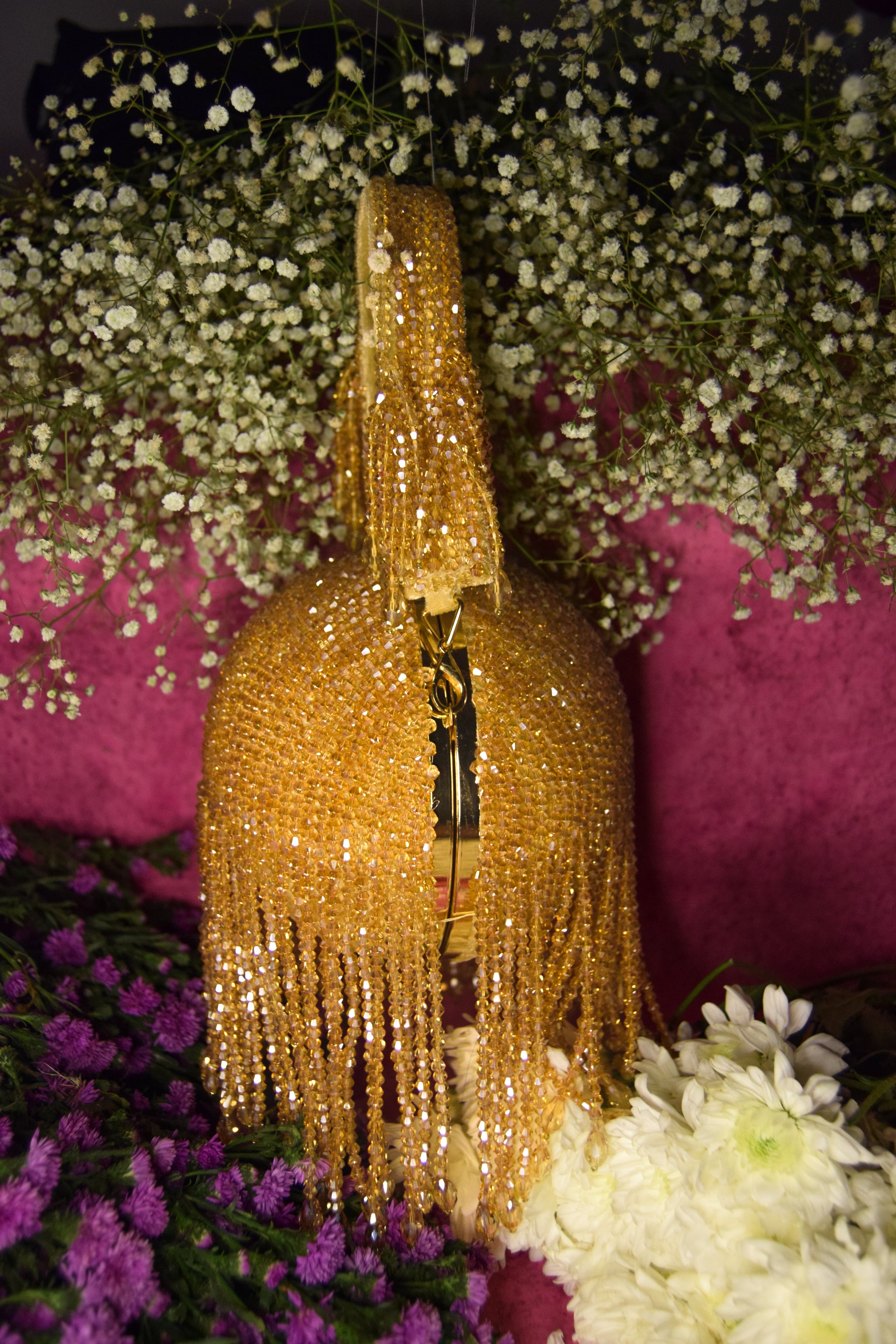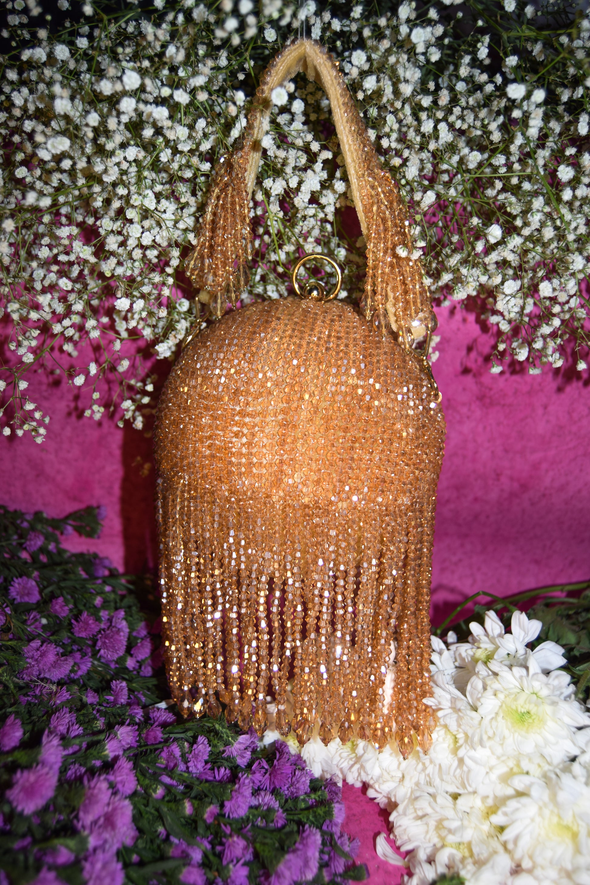 Neelofer is a ball bag adorned with heavy crystal work, available in four colours—turquoise, black, white, and yellow gold. It comes with two interchangeable straps: a sleek metal chain and a hand-embroidered belt.