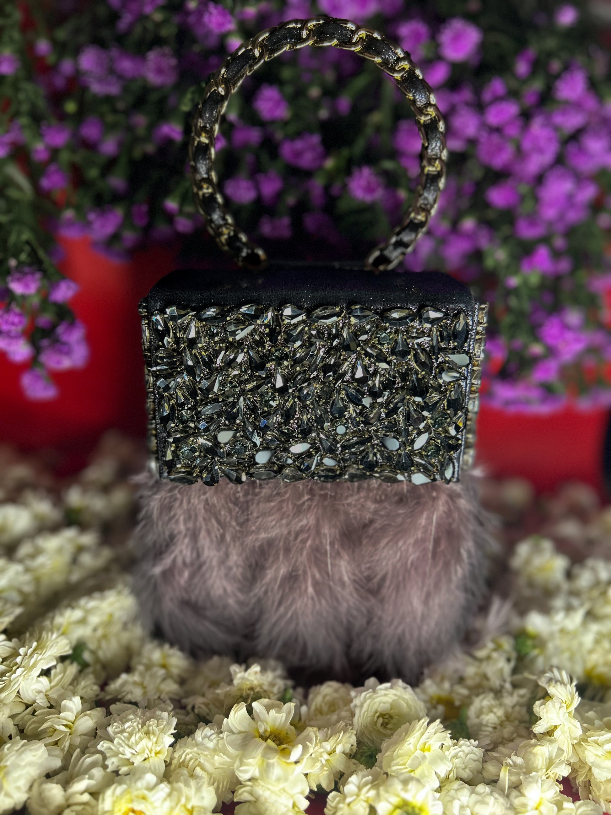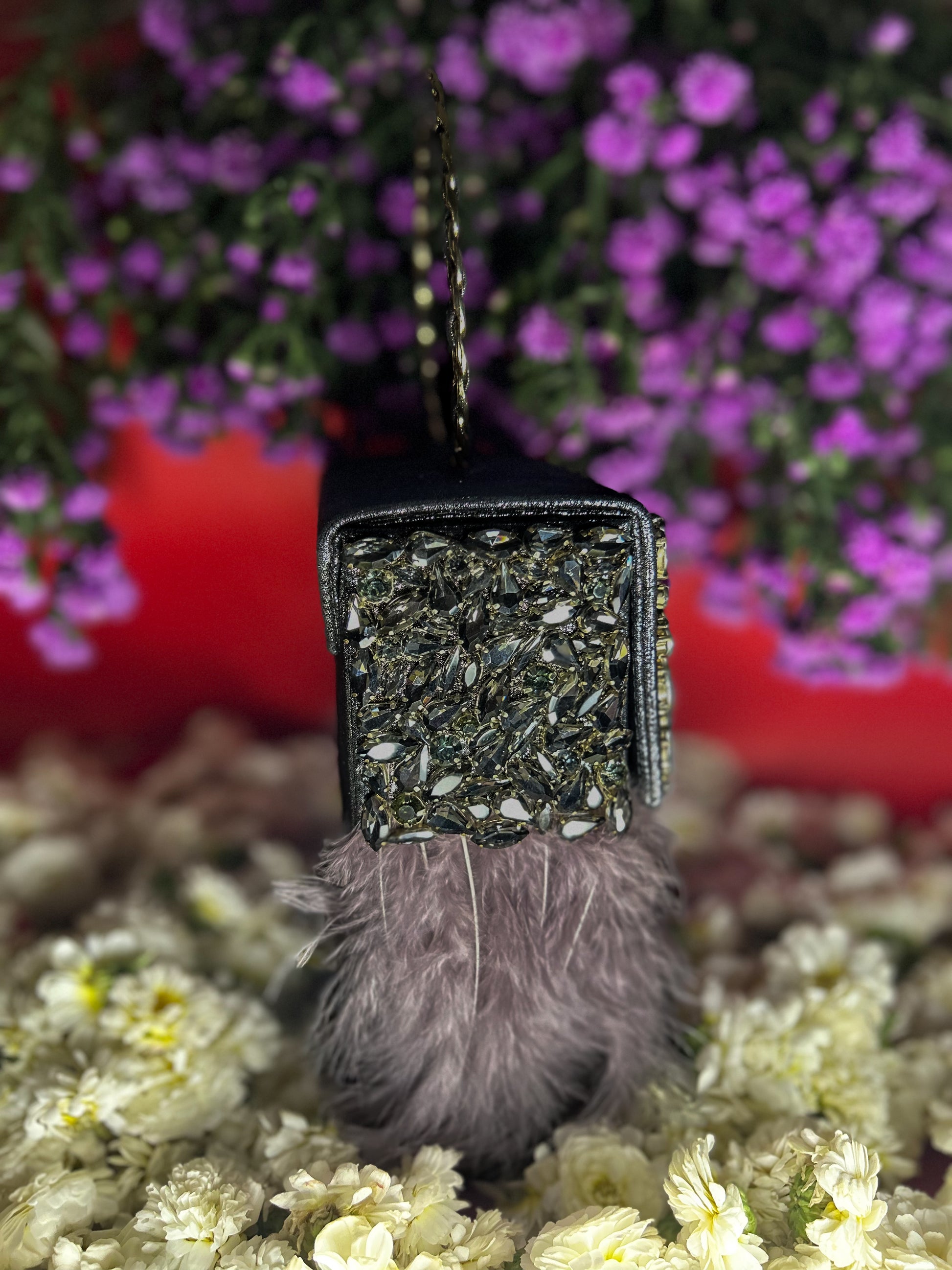 Parwaaz is a box-shaped beauty with a soft feather-covered body and a flap embellished with intricate gemstone work. Comes in two rich tones — Purple Mauve and Black. A bold statement piece with a touch of whimsy.Comes with a sleek metal chain.