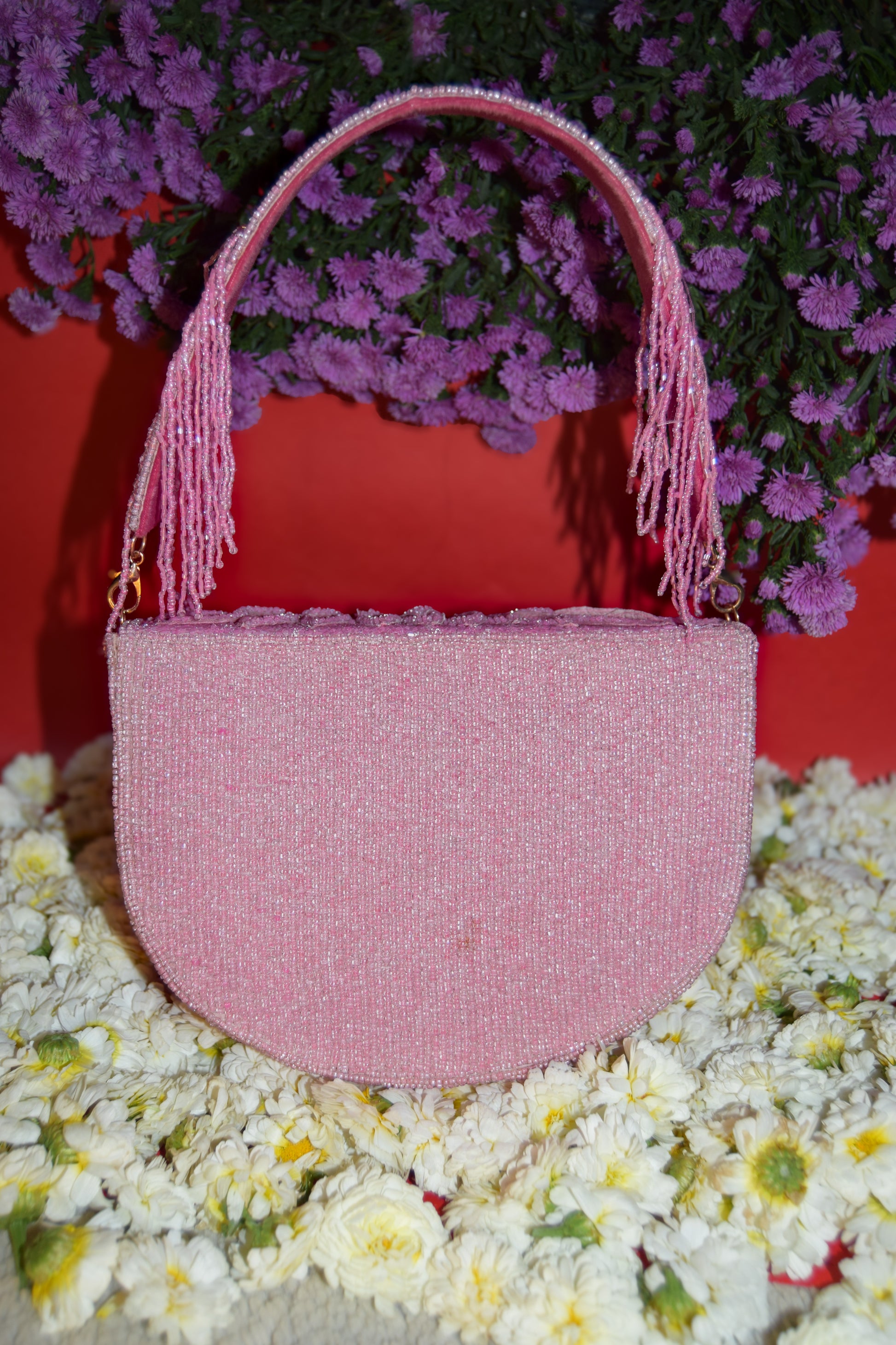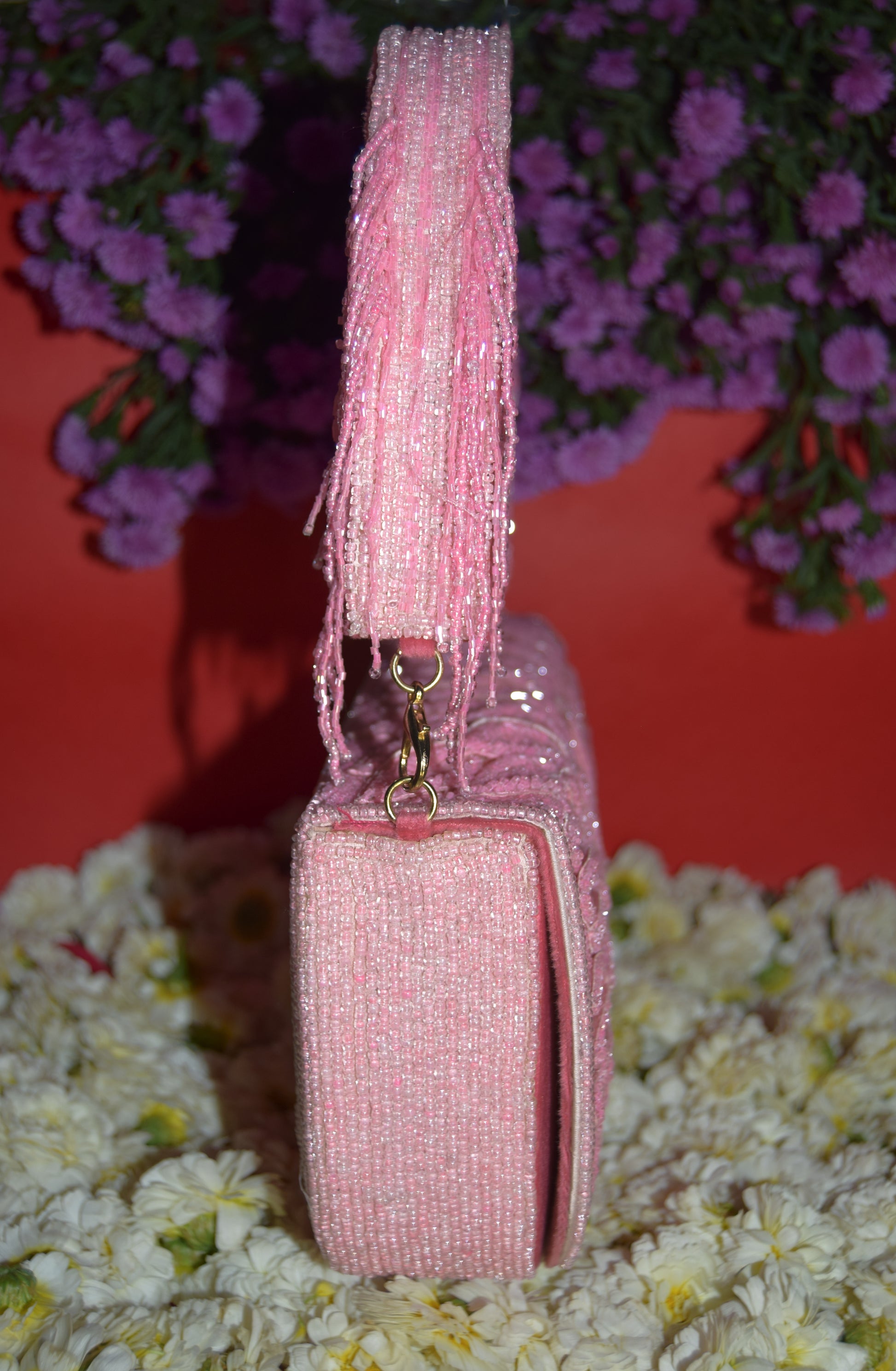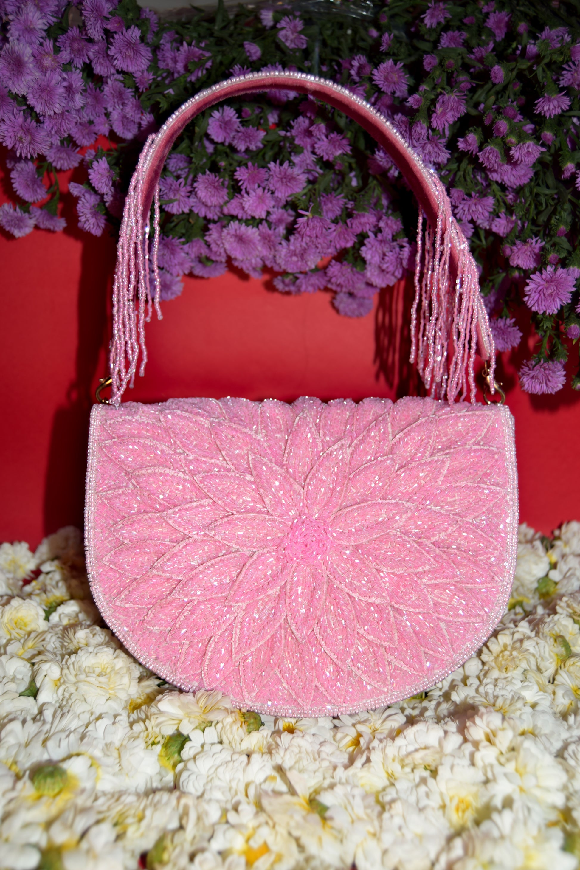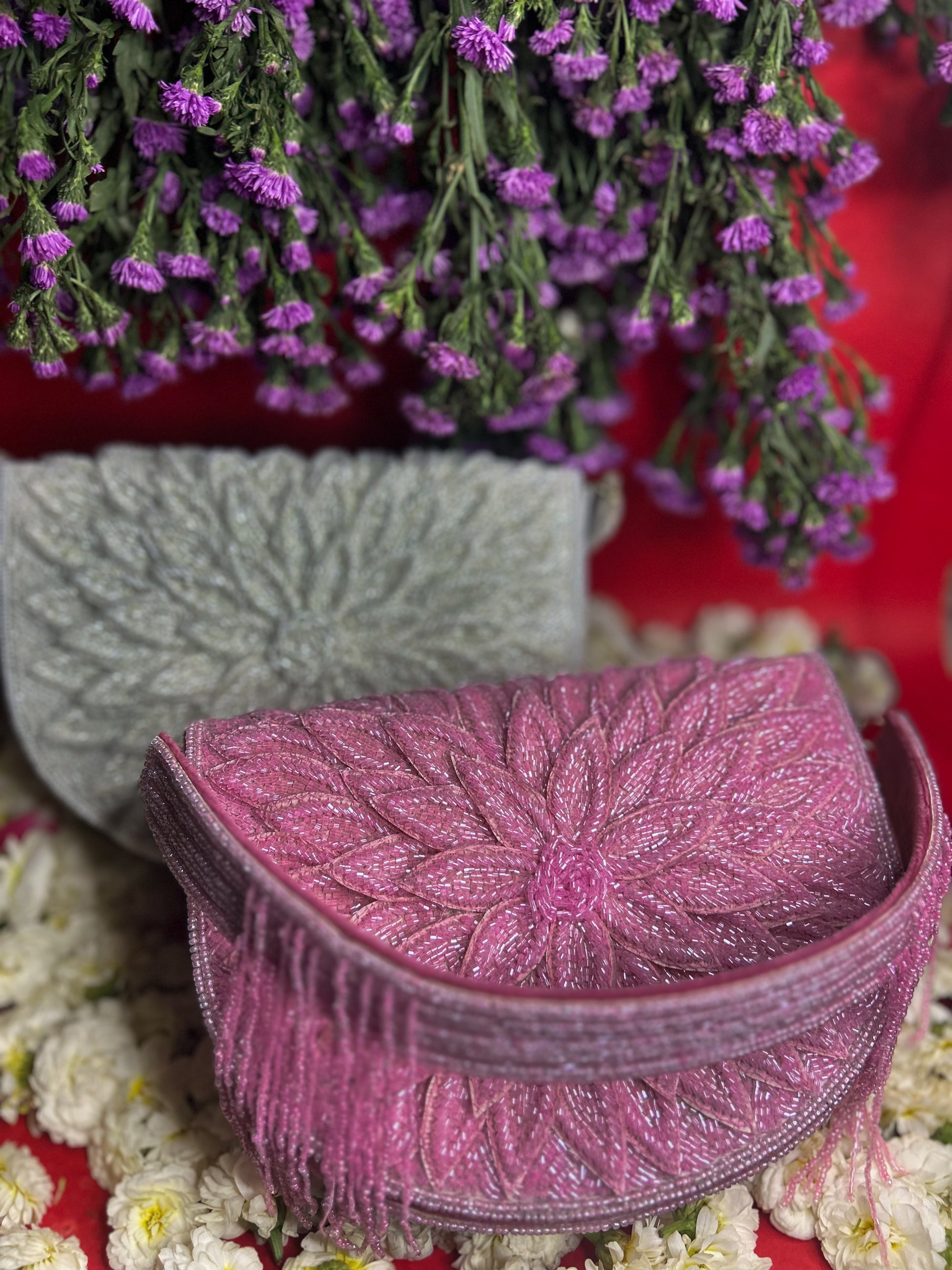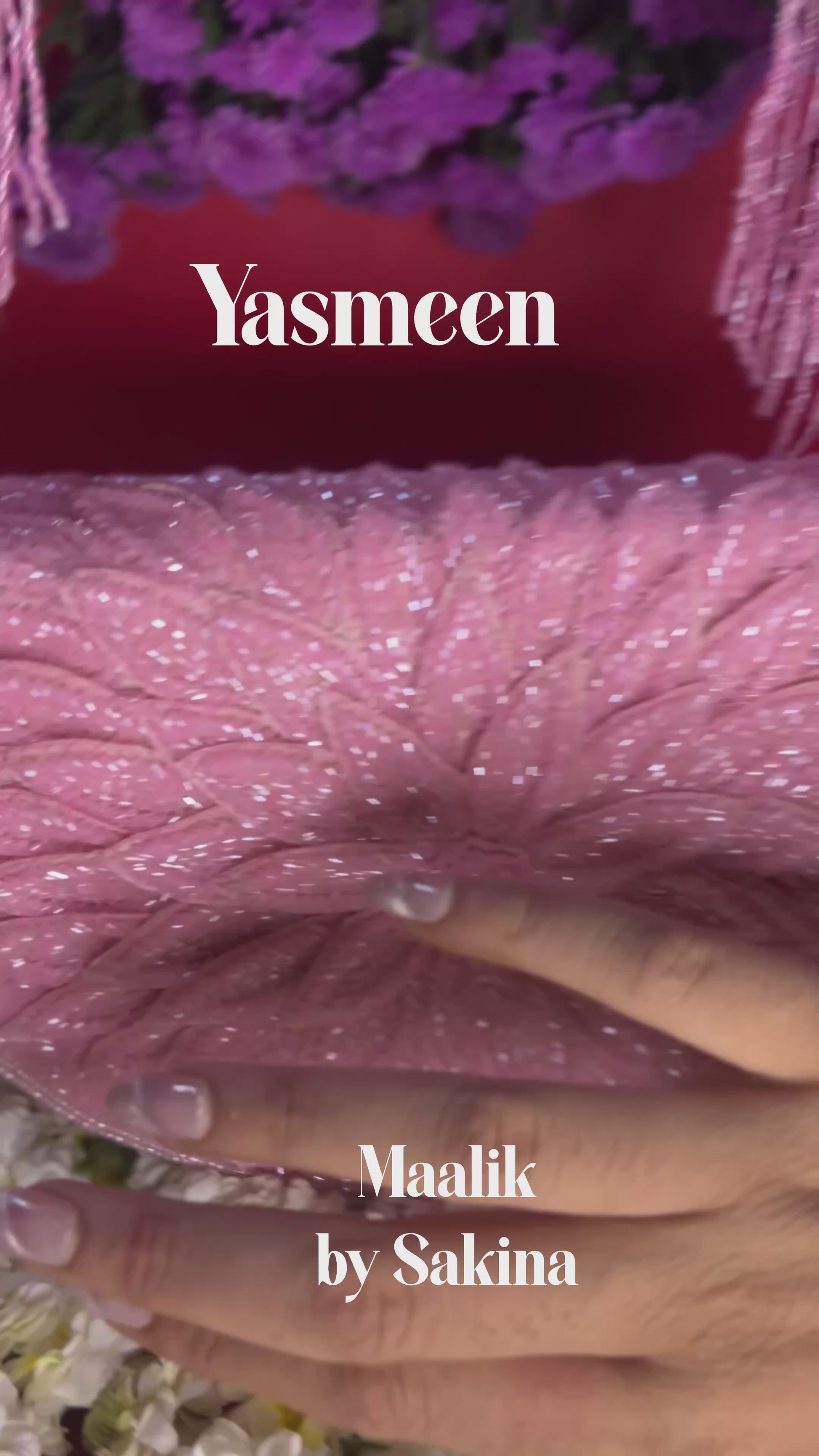 Yasmeen is a handcrafted statement piece adorned with intricate 3D cutout katdana floral work on the front and full katdana embroidery on the back. Available in soft pink and classic white, it comes with two interchangeable straps — an embellished handle for elevated elegance, and a sleek gold chain for timeless charm. Perfect for festive evenings or bridal celebrations.