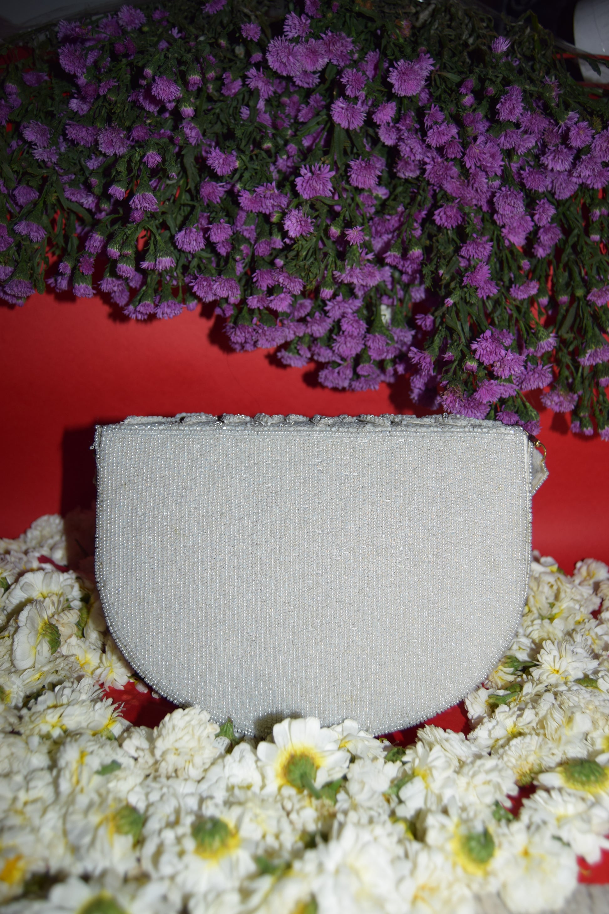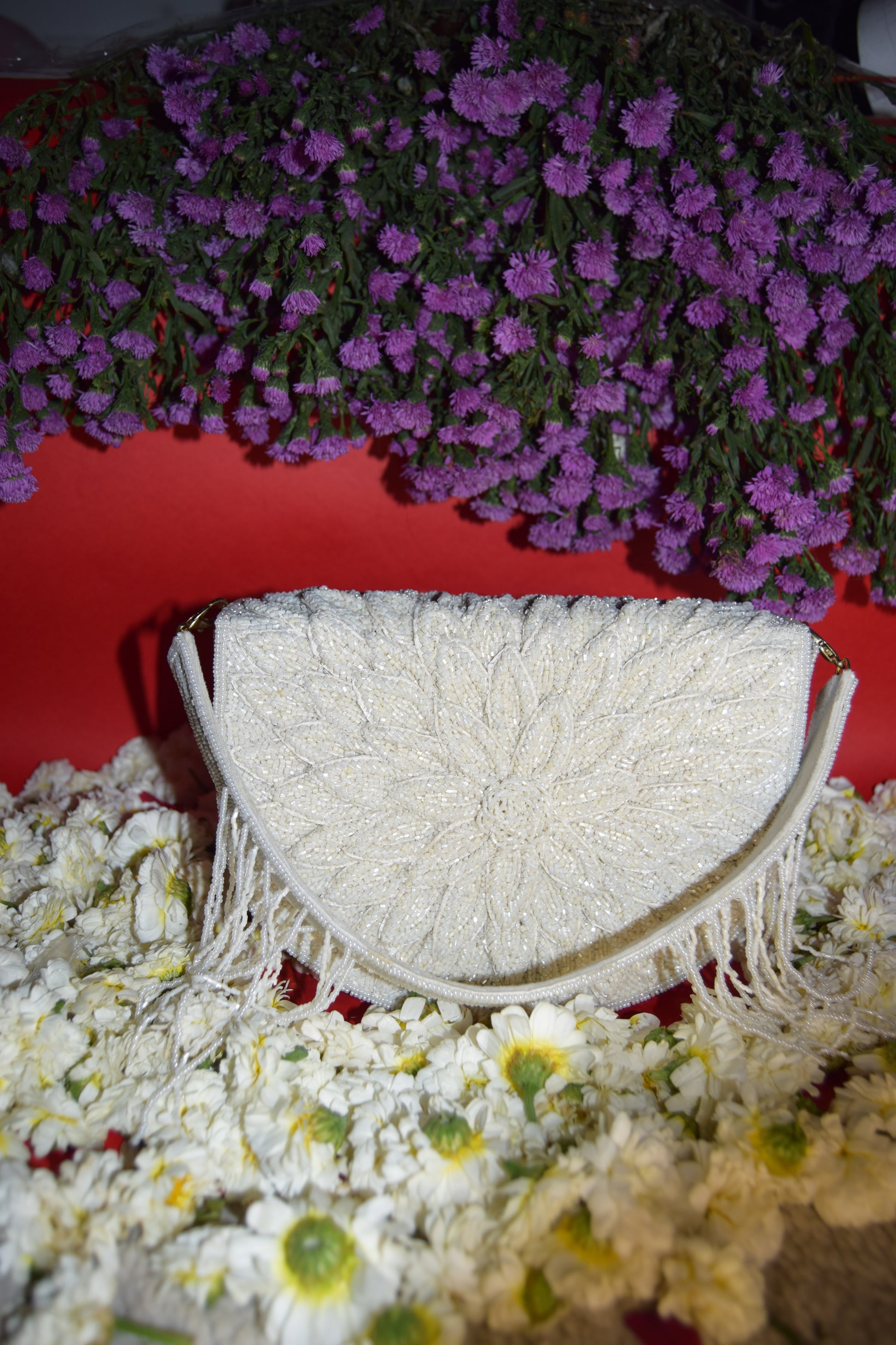 Yasmeen is a handcrafted statement piece adorned with intricate 3D cutout katdana floral work on the front and full katdana embroidery on the back. Available in soft pink and classic white, it comes with two interchangeable straps — an embellished handle for elevated elegance, and a sleek gold chain for timeless charm. Perfect for festive evenings or bridal celebrations.